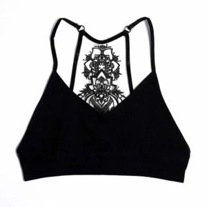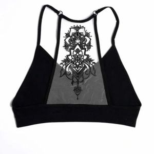 Our beautiful delicate Tattoo Bralette in a racerback style features a floral mesh panel, with stretchy & supportive seamless ribbed fabric. It has a classic V-neck front with halter style shoulder straps and a contrast mesh back featuring the embroidery tattoo detail. Non padded.