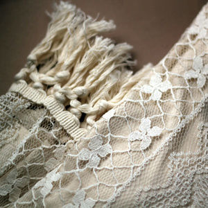 Festival ready tunic dress. Boho style vintage looking lace details. Cotton macrame fringe trimming at skirt hem. 1/2 length sleeves. 80% Cotton, 20% Nylon. 100% Polyester lining. Fully lined. Reminiscent of Free People and Show Me Your Mumu. Length from shoulder to tip of fringe is 36 inches. Last image shows exact detail but in cream.