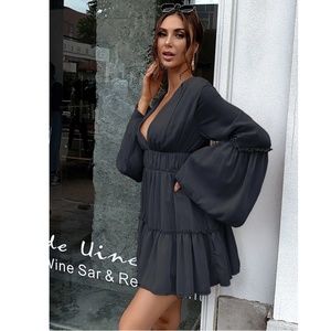 Black Boho Mini Dress Flounce Sleeves Deep V Neck