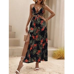 Black Boho Tropical Print Backless Maxi Dress V-Neck Floral Flared Red Green
