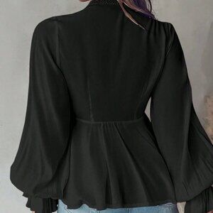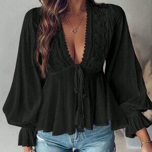 Black Boho Women's Casual Lace Patchwork Ruffle Sleeve Blouse