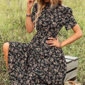 Black Boho Womens Ditsy Floral Print Petal Sleeve Layered Hem Dress