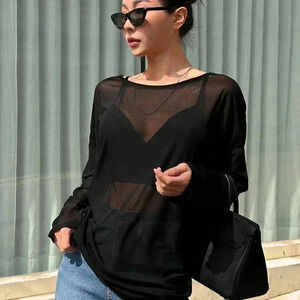 Black Boho Women's Solid Color Loose Fit Long Sleeve Round Neck Lightwei…