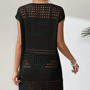 Black Boho Women's Swim Hollow Out Batwing Sleeve Cover Up Dress