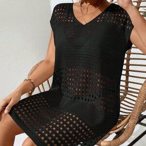 Black Boho Women's Swim Hollow Out Batwing Sleeve Cover Up Dress