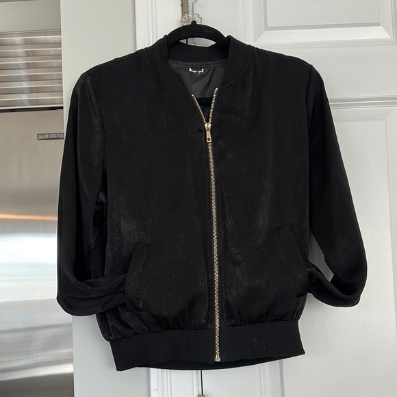 Black Bomber Jacket with Ribbed Collar and Gold Zipper