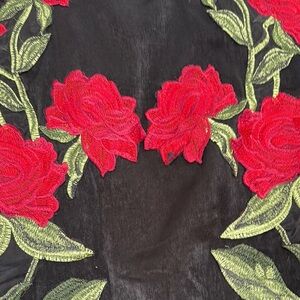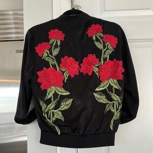 This black bomber jacket features a striking gold zipper and a ribbed collar, offering a blend of style and comfort. The elastic waistband and cuffs provide a snug fit, the flower appliqué on the back is elegant and it’s made with a silk fabric