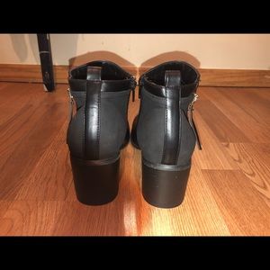 Adorable black booties, never worn, very wide ankle, zips on both sides, but only one works.