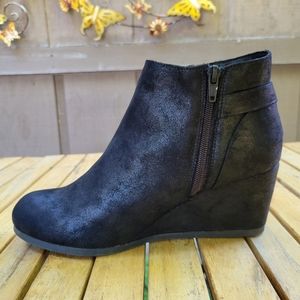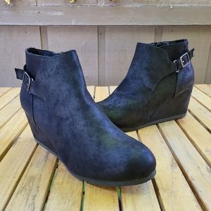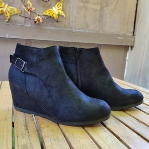 Women's size 10 brand new black ankle bootie wedges. A sort of faux suede feel to them with a side zipper and adjustable buckle.