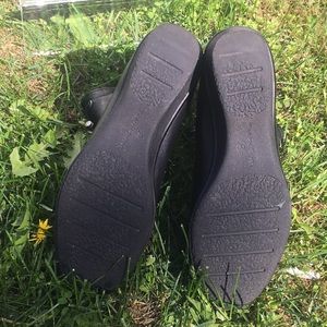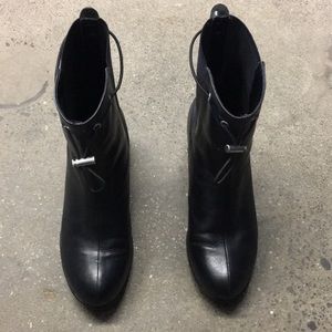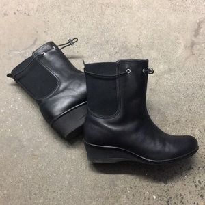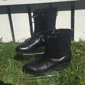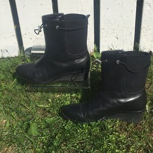 Taryn Rose black mid size ankle Boots with wedge heel size 8. Silver hardware and in good preloved condition. Approximately almost 2 inch heel. Rounded almond toe. Sleek and pretty.