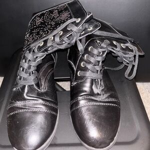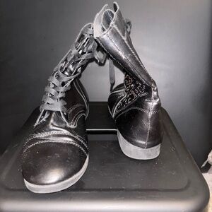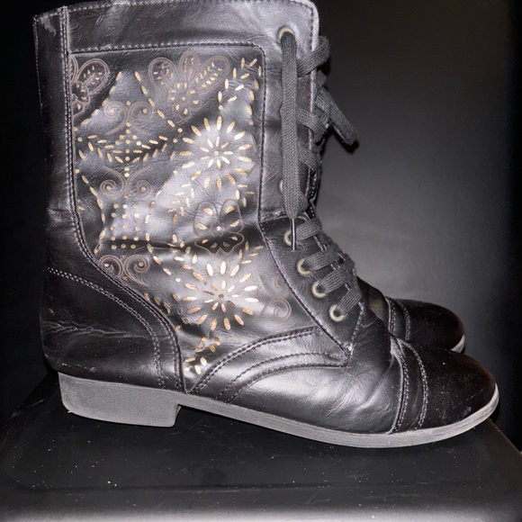 Size L 8/9, black combat boots, Rue21, cutouts with gold underneath