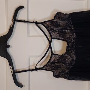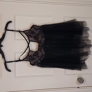 Black Bow Teresa Underwire Chemise featuring a tulle skirt and strappy underwire cups. The material has a good amount of stretch, and the back has a hook and eye closure.