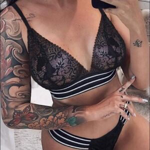 Beautiful and Sexy Stretch lace with strappy band detailing. Bralette top with matching panties.