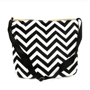 Has two pockets on the outside (one has a small stain - see picture). A large pocket in the inside (snap closure). Inside the bag, a zipper pocket and two regular drop pockets.