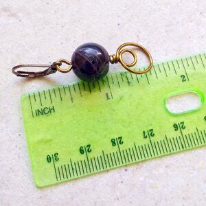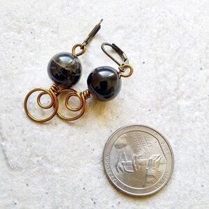 I only made one pair of these, as these stones came in a mixed batch of semi precious stones and I had a heck of hard time finding a matching pair, LOL. Not exactly sure what they are - they look like what is often referred to as Tigerwood Stone [not Tigerseye, although the coloring can be somewhat similar] but I'm not a 100% sure. Mostly black, with some earth tones in the matrix, and a bit of the shimmer of a Tigerseye or Labradorite stone. The pattern is very subtle - and they look mostly dark brown unless the light hits them just right. I went with bronze jewelry wire for the wire wrapped elements, and added bronze leverback earwires to finish them off.