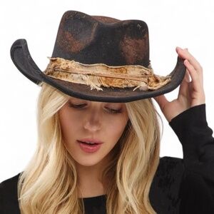 Vintage-inspired cowboy hat featuring a textured finish, layered beaded band, and feather accent. Ideal for rustic events, themed parties, or adding a bold western flair to casual outfits.