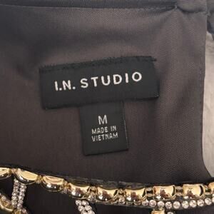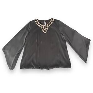Black Bubble Hem Blouse Medium Gold Rhinestone Collar Top Shirt Bell I.N. Studio