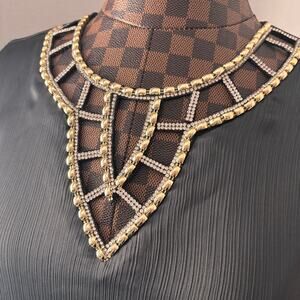 Black textured polyester with gold and rhinestone open peek-a-boo collar detail