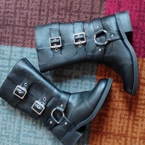 Pre loved condition Stylish black boots with buckle straps. Perfect for a chic look.