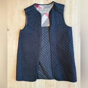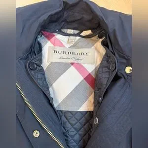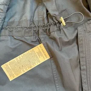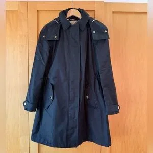 Black Burberry Raincoat with button out quilted lining. Hood has storm flap and zips off. Gold hardware. Adjustable waist. Signature plaid details. Snap closure pockets. Epaulets at shoulder and sleeve cuff.
