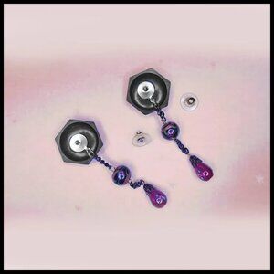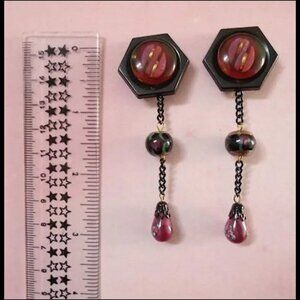 Flaunt your love for the unusual. These unique long black earrings may be able to help. Seriously OOAK (one of a kind) handmade recycled vintage with skinny dangles. Surgical steel posts, disc clutches. Photos can do no justice to the detail on the posts, but most of my pics are High Res, so DO enlarge photo 3 to see details best. The Lucite inserts were buttons, clear Lucite with strips of metallic gold on AURORA/opalescent ovals. Black "Japanned" vintage chain. Unusual, not-your-everyday Venetian beads and burgundy lamp bead drops, ALL vintage. Bead caps were painted with black enamel. Oddly designed: sleek dangles hang from from bigger posts. (I started designing jewelry using recycled vintage in 1991, stopped years ago. I have made over 1000 pairs of earrings and this pair is number 953.) Will come in a gift box.