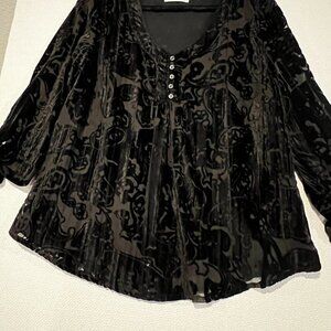 Black Burnout Velvet Peasant Top Floral Semi Sheer Fairy Whimsey Goth Size L