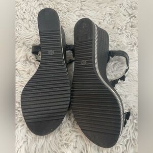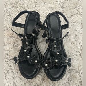 🦋 Black Butterfly & Pearl Wedge Sandals