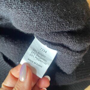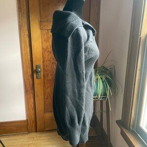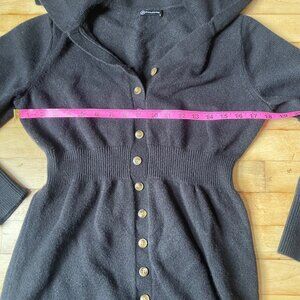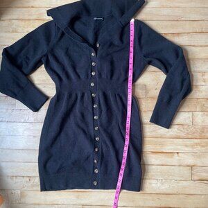 Soft black sweater dress with gold button front and fitted waist. Flattering cropped length (29”), can be worn as a mini dress or open as a cardigan. Cozy knit fabric with a witchy classic quiet-luxury vibe.