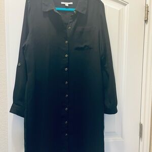 This black button-up dress is perfect for any occasion. Removable belt & sleeves roll up with a tab button design. Worn once. Its sleek design and comfortable fit make it a wardrobe essential.