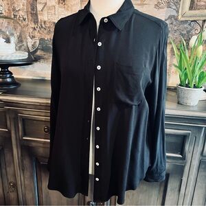Stylish black button-up shirt with white buttons. Perfect for any occasion.