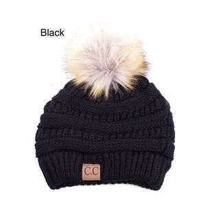 CC Faux Fur Pom Pom Knit Beanie Colors: Black 100% Acrylic BIN11