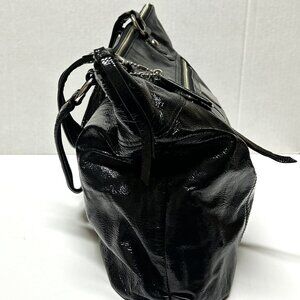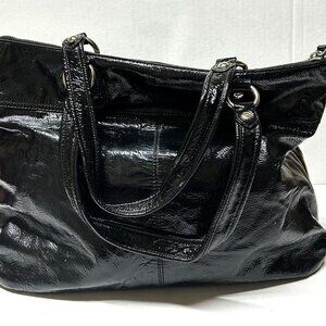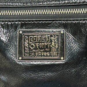 This listing is for a black COACH Poppy medium to large size shoulder bag. It has double black leather handles and a full zipper enclosure. The front features a zipper pocket with the COACH POPPY metal decal. The interior is lined with a pink satin material with a modern pink heart design. It features one zippered pocket and two open slip pockets and a pen slip pocket. It is approximately 15 inches across and 12 inches tall with an open depth. This purse does have some slight staining on the interior - I think from makeup which could possibly be easily removed.