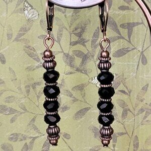 Each earring has four 6mm faceted black colored rondelle crystals, copper tone findings, suspended from copper plated, brass lever back ear wires.