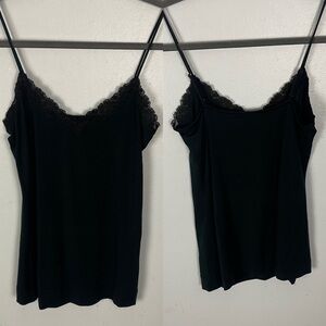Soft and stretchy black cami with lace trim along the neckline and adjustable spaghetti style straps. This item has been gently worn, washed and does not have tags.