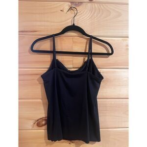 Black cami with lace detailing on chest. Raw hem as it was cropped slightly. Size M. Great elevated basic for your closet and a night out! Exact measurements below.