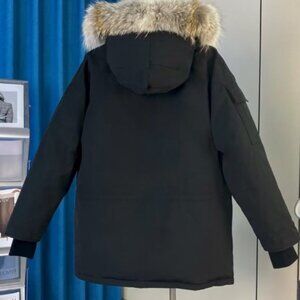Sleek black jacket with fur-trimmed hood. Ideal for cold weather. Features multiple pockets and durable design.