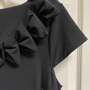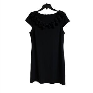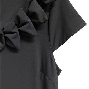 Black cap sleeve polyester crepe stress with bow and ruffle neckline embellishments.