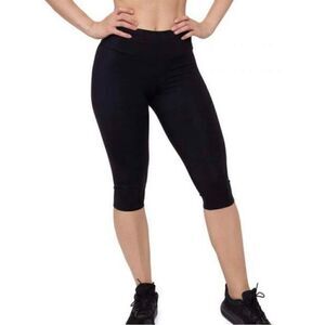 These pre-owned pants are in excellent condition, offering both style and comfort for your active lifestyle. These black capri stretch pants are crafted from 88% Polyamide and 12% Elastane, offering flexibility and comfort for your activities. The large waistband provides both comfort and security during your workouts.