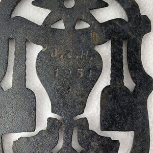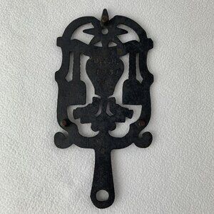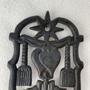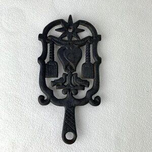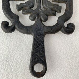 Black Cast Iron Trivet Hearts Star Broom Love Birds Footed 9" Vintage