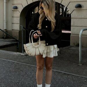 A casual and comfortable cardigan with a regular fit, featuring a round neck and lantern sleeves. This short-length cardigan has a black color and a pattern of plants, making it a great addition to any wardrobe.
