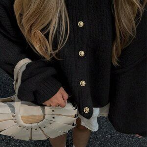 Black Casual Loose Women's Round Neck Lantern Sleeve Cardigan