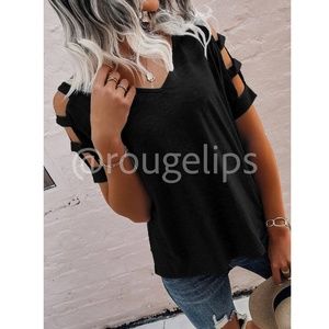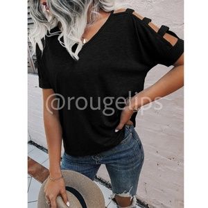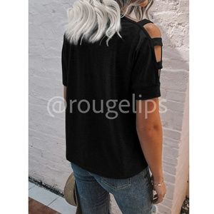 Black Casual Tee Shirt Cold Shoulder, Straps Short Sleeve Regular Fit
