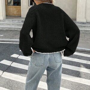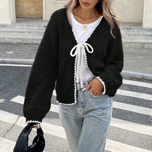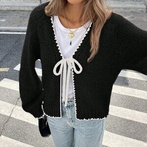 Black Casual Women's Color Block Drawstring Knitted Sweater Cardigan