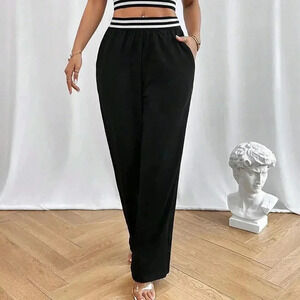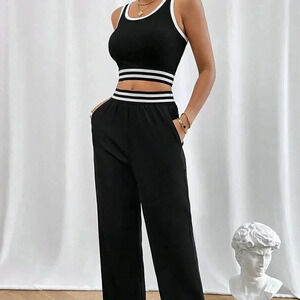 Black Casual Women's Contrast Binding Crop Tank Top & Pants