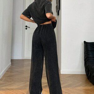 Black Casual Women's Crew Neck Short Sleeve Straight Leg Pants