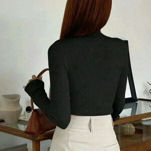 Black Casual Women's Cut Out Mock Neck Ribbed Knit Sweater
