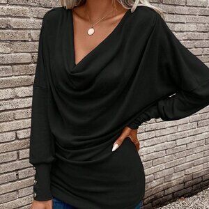 Elevate your everyday style with this black casual draped button long sleeve t-shirt, featuring a comfortable regular fit and cowl neck design. It has long sleeves and a draped button detail for a relaxed look.