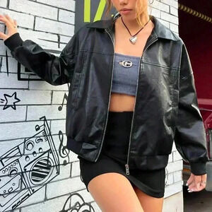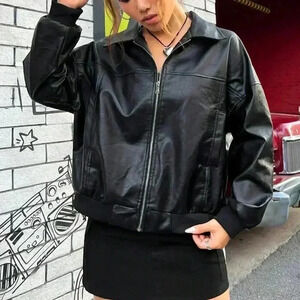 Black Casual Women's Drop Shoulder Zipper Patent Jacket