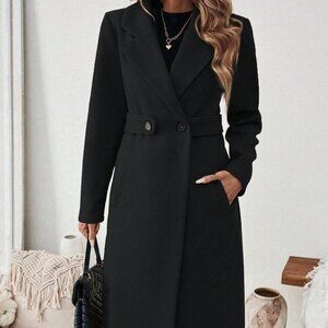 Black Casual Women's Flat Collar Pocket Belted Long Sleeve Coat Jacket