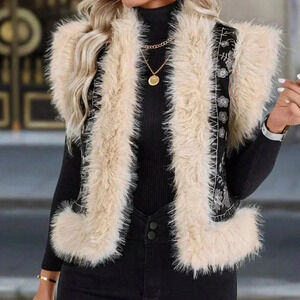 Black Casual Women's Floral Embroidered Plush Spliced Sleeveless Jacket